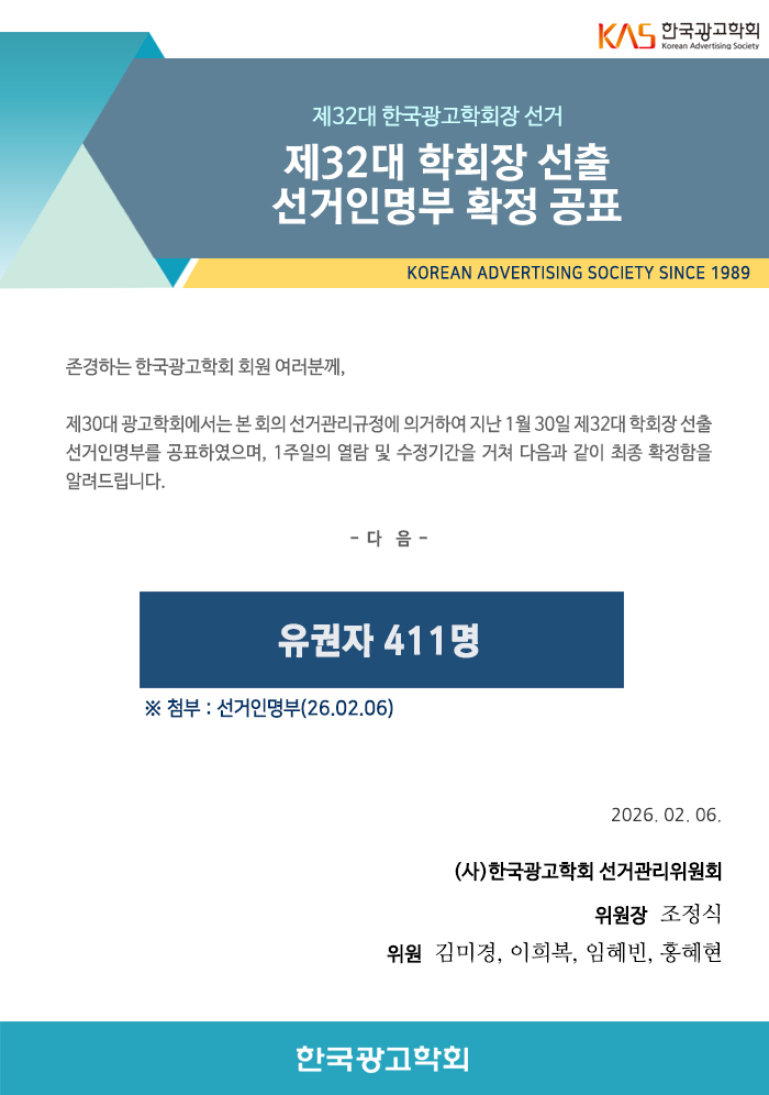 제32대 한국광고학회장 선출 선거인명부 확정 공표
