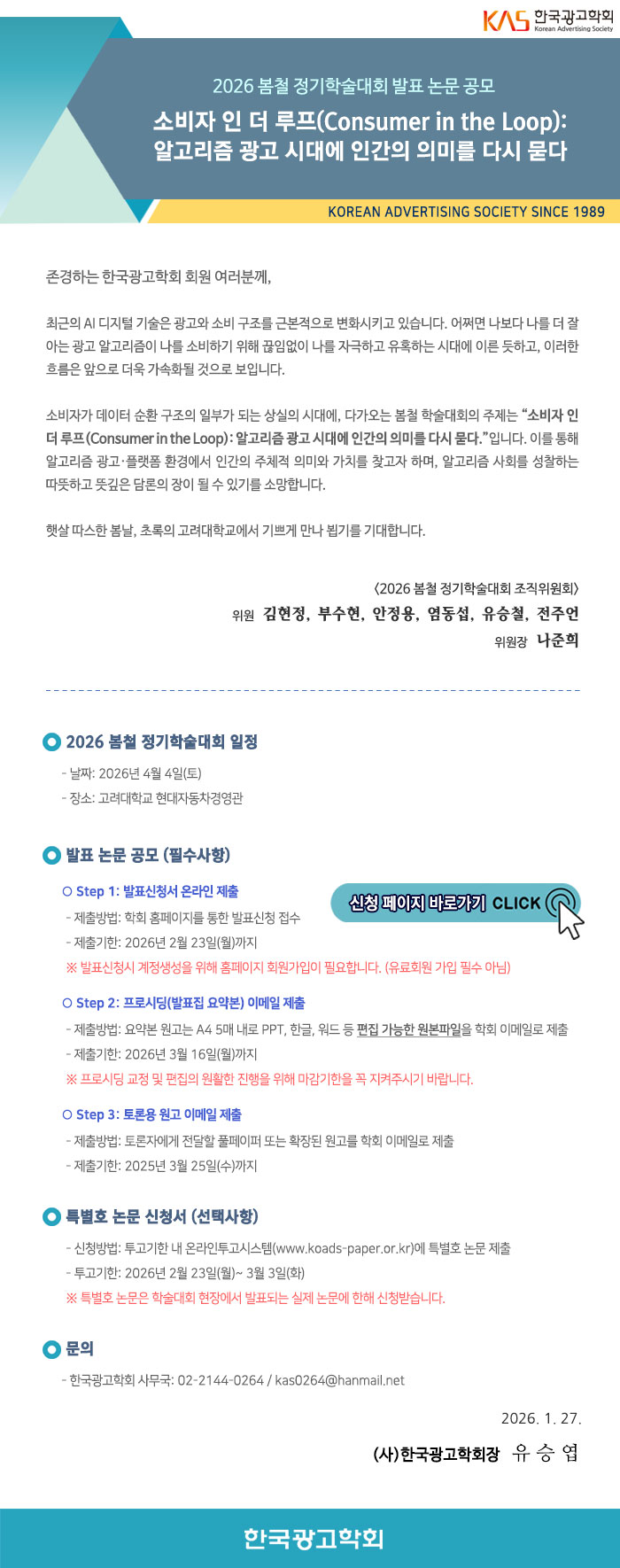 2026 봄철 정기학술대회 발표 논문 공모 (~2월 23일 월요일까지)